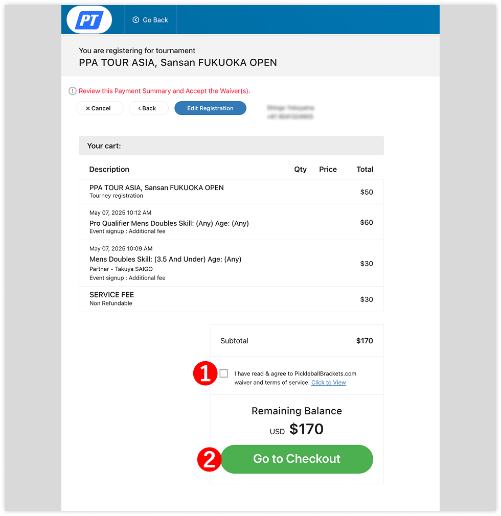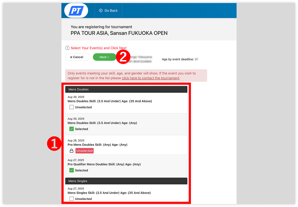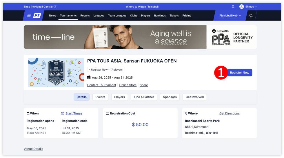 ❶Pickleball Tournament.com内の本大会のエントリーに進む