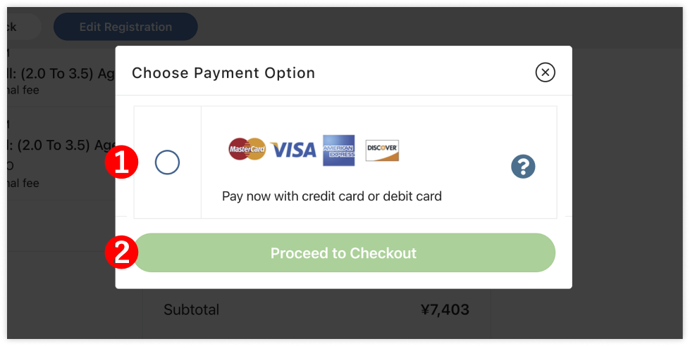 - ① カード決済のみ対応していますので、チェックを入れる ※ 決済はクレジットカードのみとなります