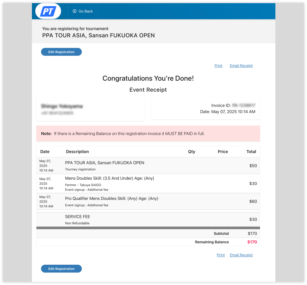 国際大会で利用されるピックルボール専用のトーナメントエントリーシステム