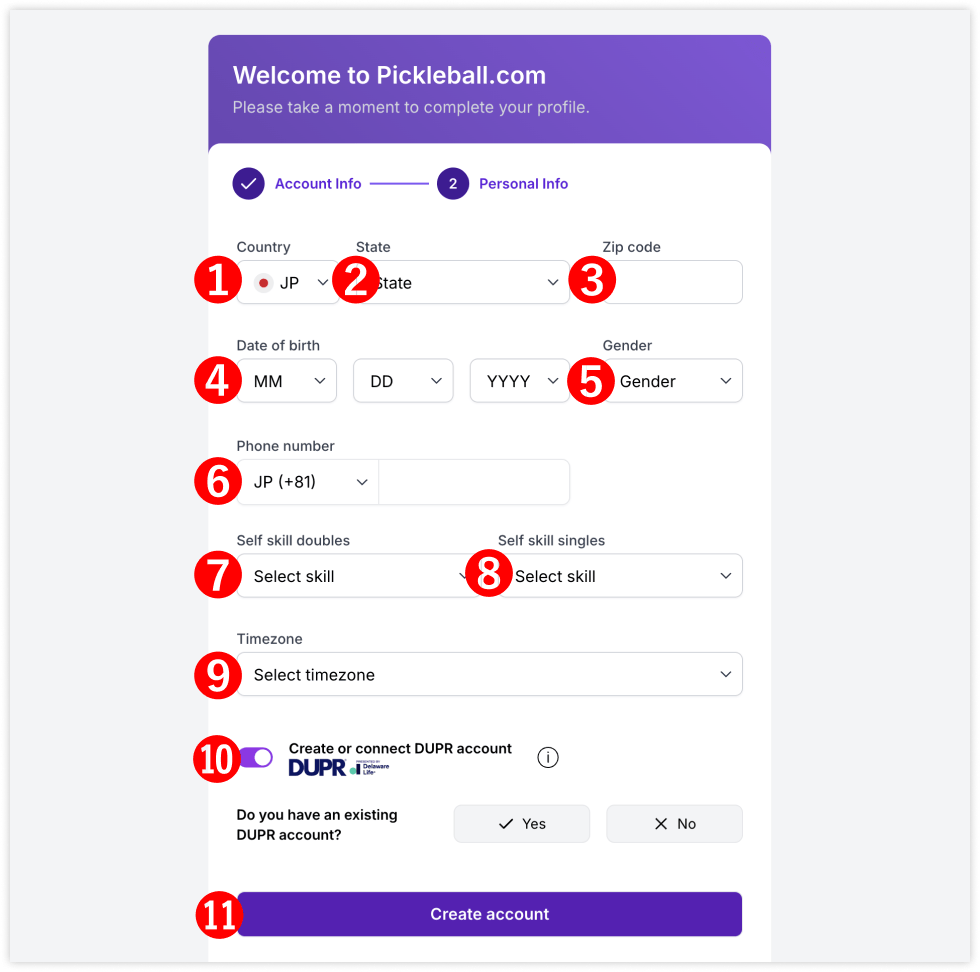 - ⑩ DUPR連携の有無 ※ DUPRを未登録の方は、本ページ上部の「DUPRの登録」を参考に登録してください