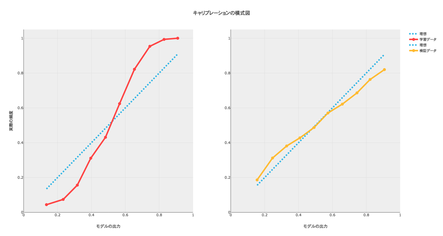 下の図において、モデルの出力と実際の頻度における関係が理想的な青色の線から乖離しているのを補正します。scikit-learnのドキュメントの絵を見ると、下の図中で左のグラフに似た図がありますが、われわれが関心があるのは汎化性能なので右のグラフ、つまり検証のデータに対して補正をするのが正しいようです。元のコードでも検証データを相手にしています。1