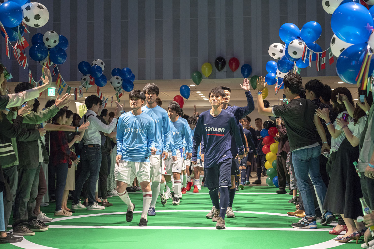 偶然にも、創業記念パーティーが開催された6月15日は、2018 FIFAワールドカップの開幕翌日ということで、今年のテーマは「ワールドカップ」! 会場では、Sansan事業部とEight事業部のサッカー対決が始まりました。