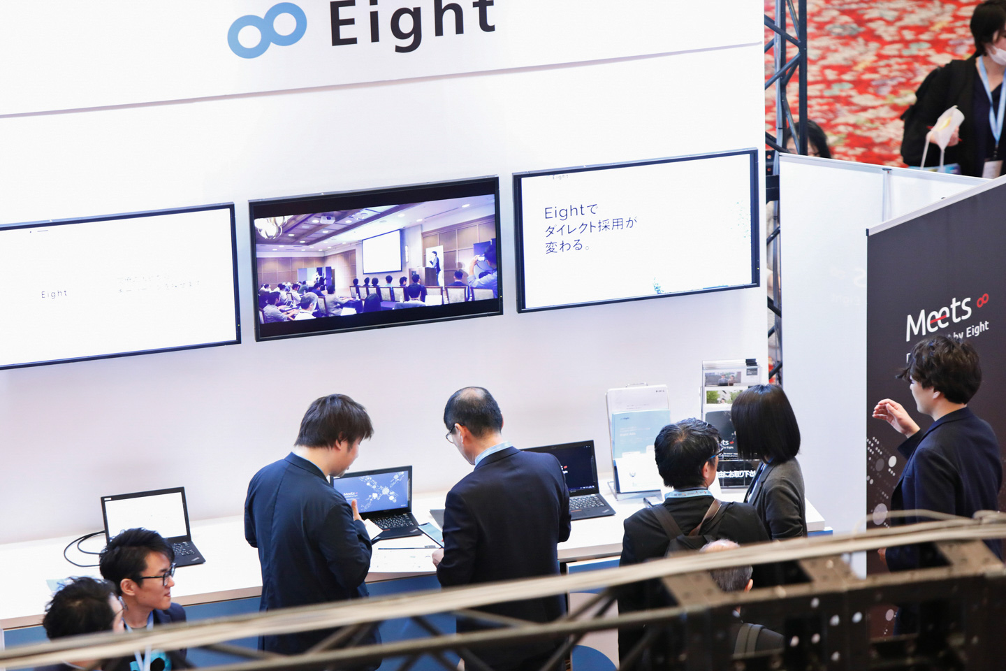 Sansan株式会社からは、クラウド名刺管理サービス「Sansan」、名刺アプリ「Eight」、そしてデータ統括部門の「DSOC」がそれぞれブースを出展。