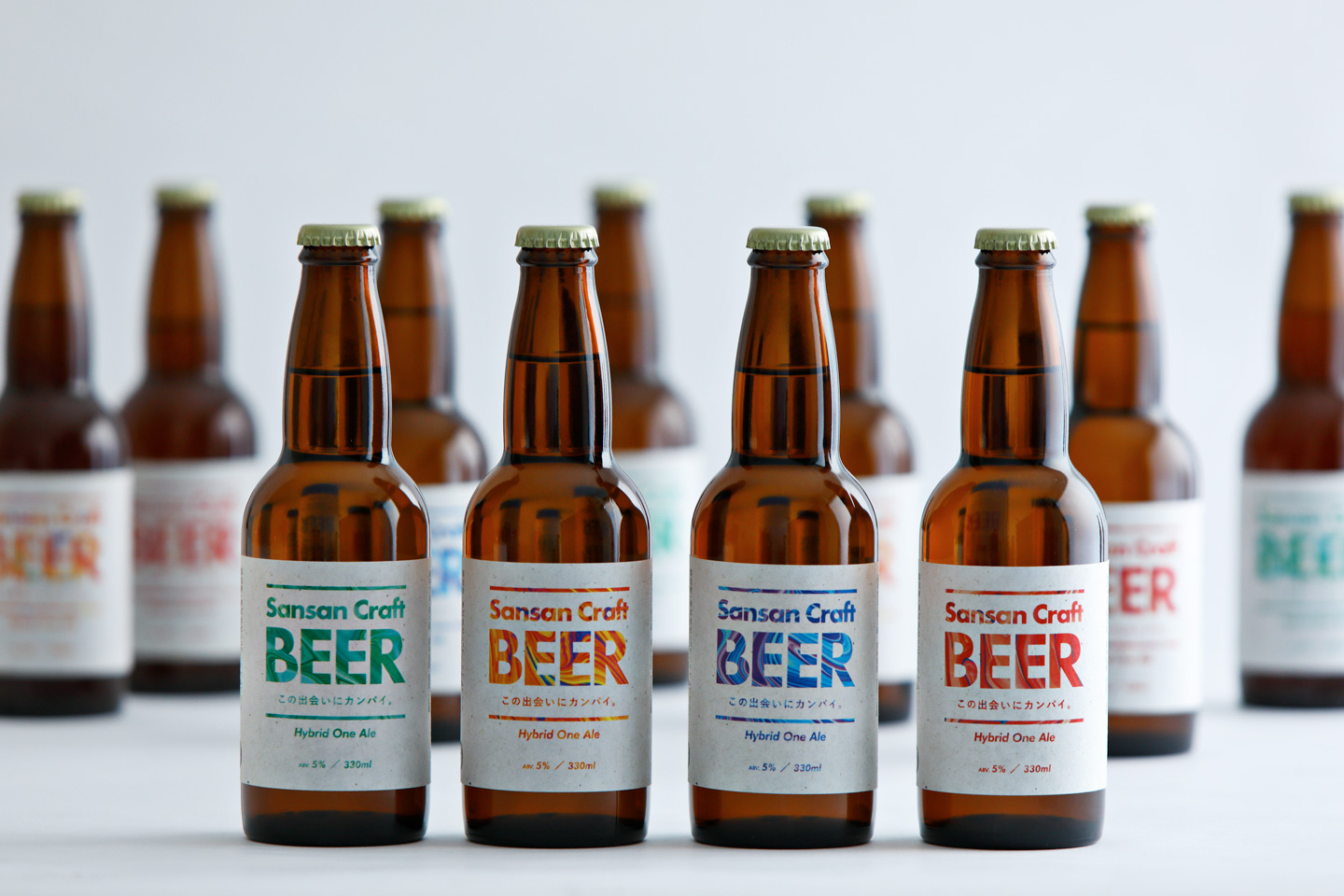 オリジナルクラフトビールは、現在はイベントクリエイティブやノベルティーの一つとして業務の中で作っていますが、最初は違いました。JuiceというSansanの取り組みの中で思い付いて、始めたんです。当時のJuiceは、ICEという名前の取り組みでしたが、業務から離れて自由にクリエイティブを作ったり、ディスカッションできたりする活動時間が毎週3時間あったんです。その中で、あるデザイナーのメンバーと話していたときに、何となくビールに話題が移りました。それで「じゃあ、次のイベントに合わせて造っちゃいますか」と始めたんですよね。Sansanのサテライトオフィスがある、徳島県・神山町のブルワリー「KAMIYAMA BEER」と共同開発。Sansanのミッションをテーマにして、ラガー酵母とエール酵母という2種類の酵母を使用して醸造したオリジナルクラフトビール。