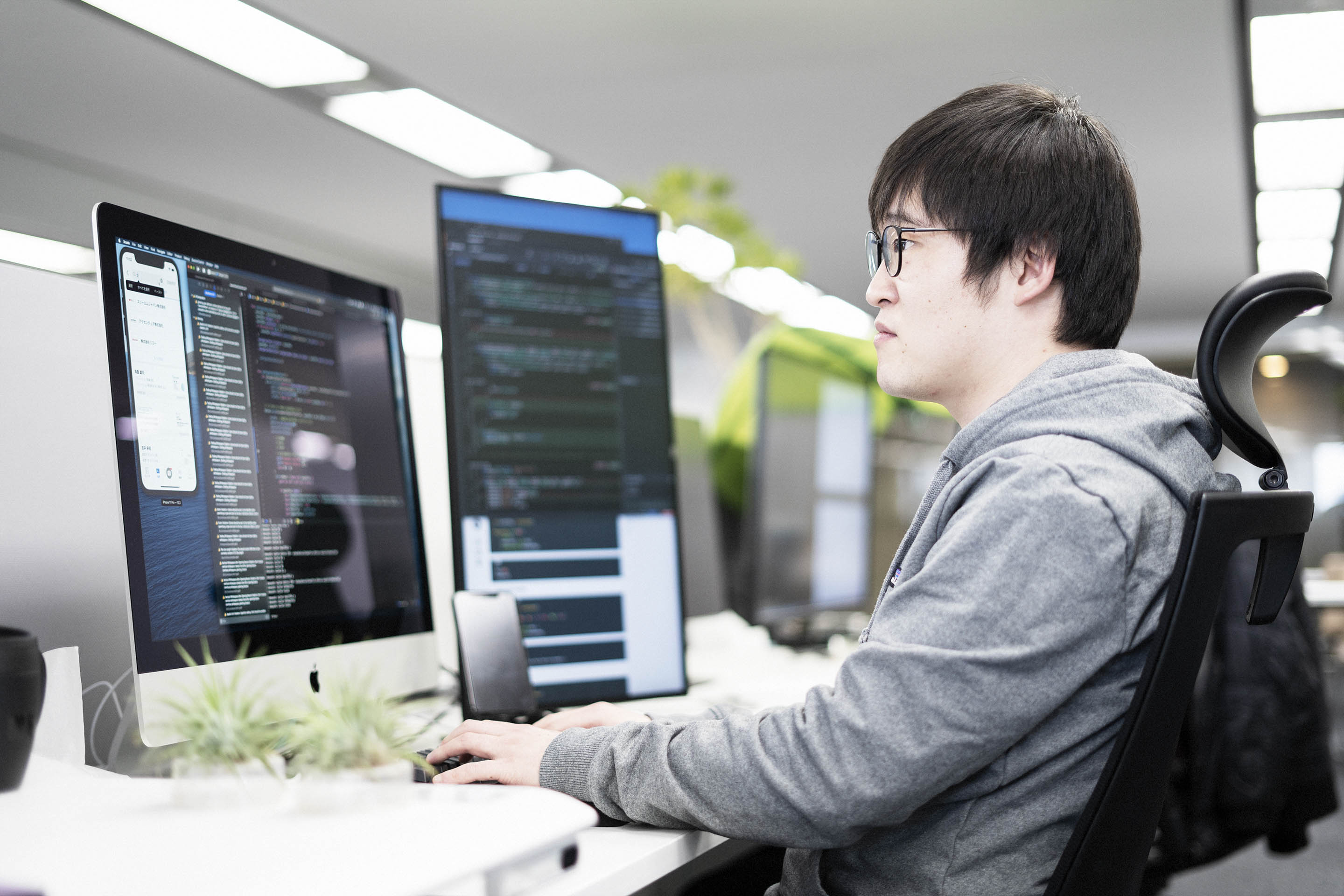 SansanのiOSアプリ開発を担当しています。要件に対して、PMやデザイナー、サーバーサイドの各担当者と連携しながらアプリ開発を進めていくことが主な仕事です。開発業務以外では、中途採用の面接官として候補者との1次面接やカジュアル面談を対応しています。なぜSansanに転職したんですか?