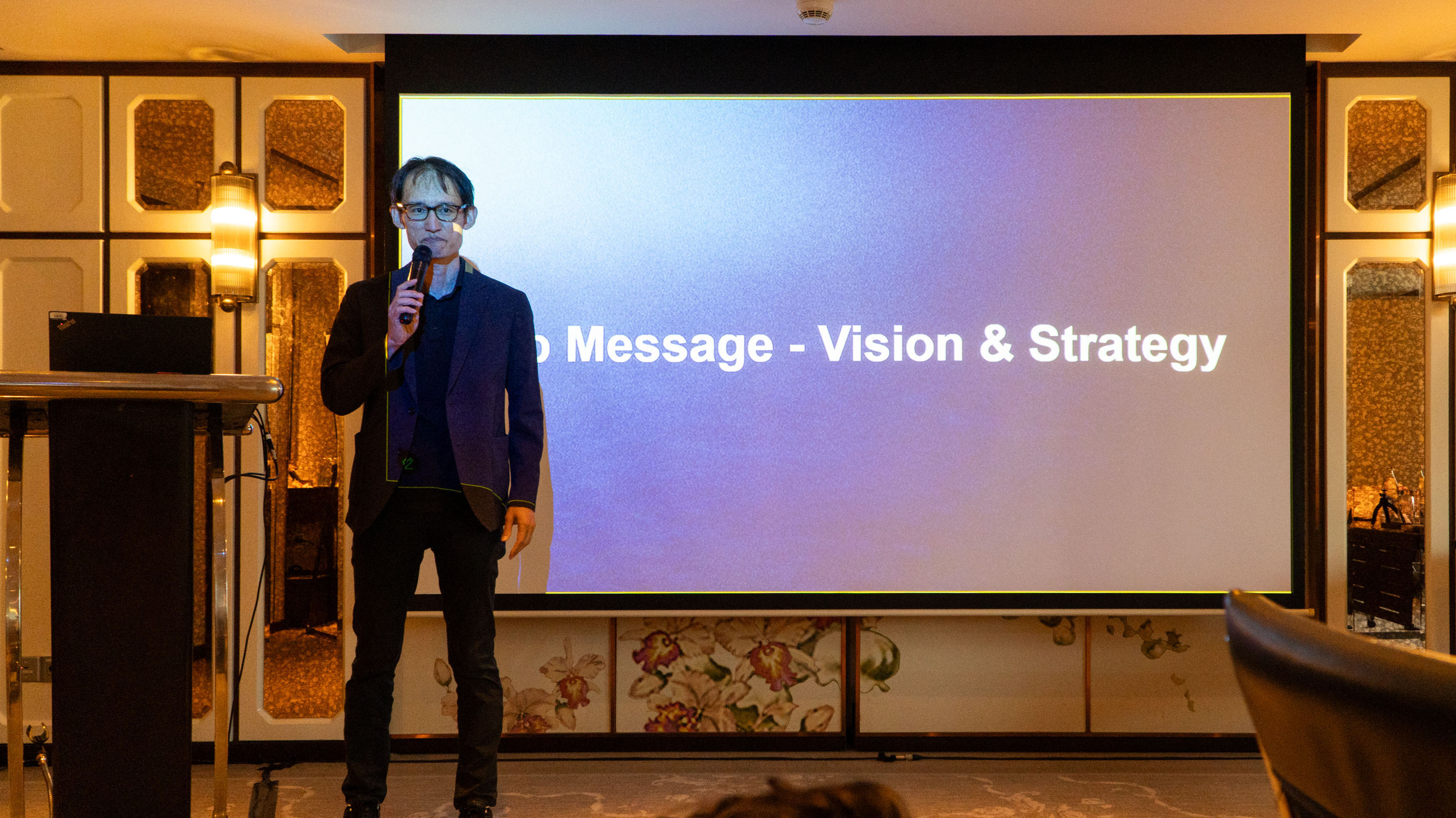 続いて、Managing Directorの福田が、これからのグローバル戦略を熱く語ります。就任後、初めて全メンバーが顔を合わせたこの場で、戦略に対する期待や質問が次々と飛び交い、会場全体の熱気はさらに高まっていきます。