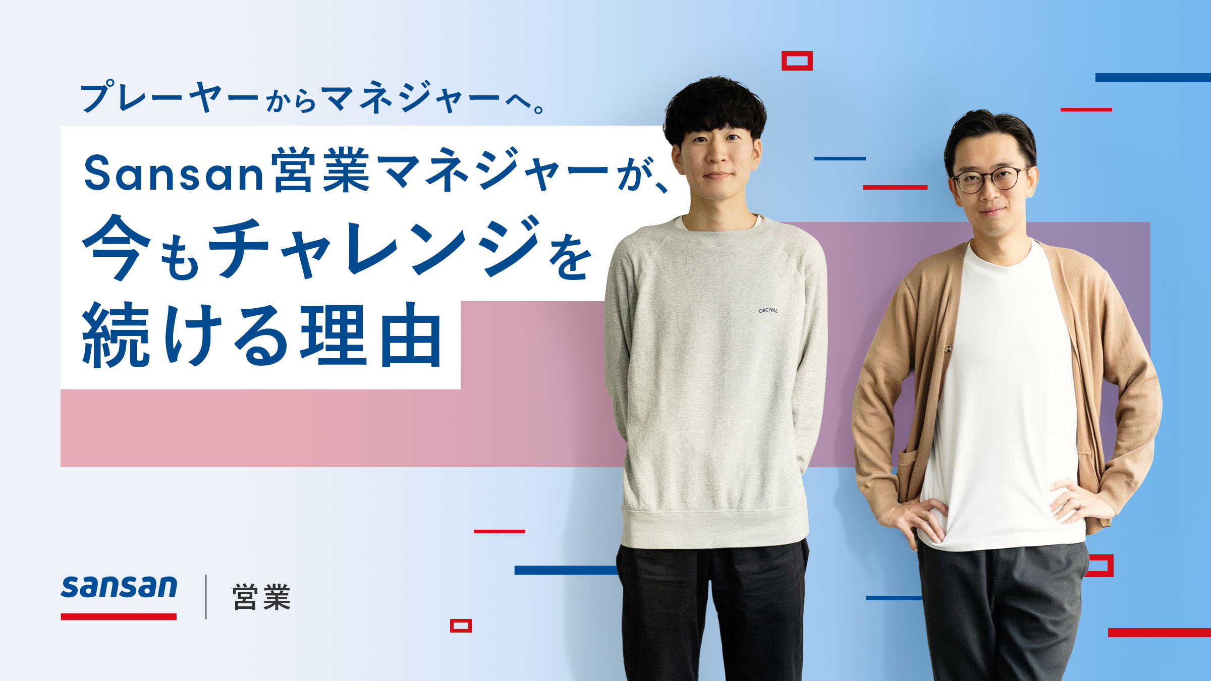 異業種から転職し、フィールドセールスとして配属された営業部門でMVPを2度獲得。プレーヤーとしての活躍を経て、入社後約2年でマネジャーに昇格した江口。MVPの継続獲得も、マネジャーへの昇格も、明確に目標として掲げたものだったと言います。彼がなぜその目標を掲げたのか、なぜSansanでフィールドセールスのマネジャーというキャリアを選んだのか。その裏側には、「チャレンジ」という大きなテーマがありました。江口の成長を見守ってきた杉本とともに、チャレンジの道のりを語ってもらいます。