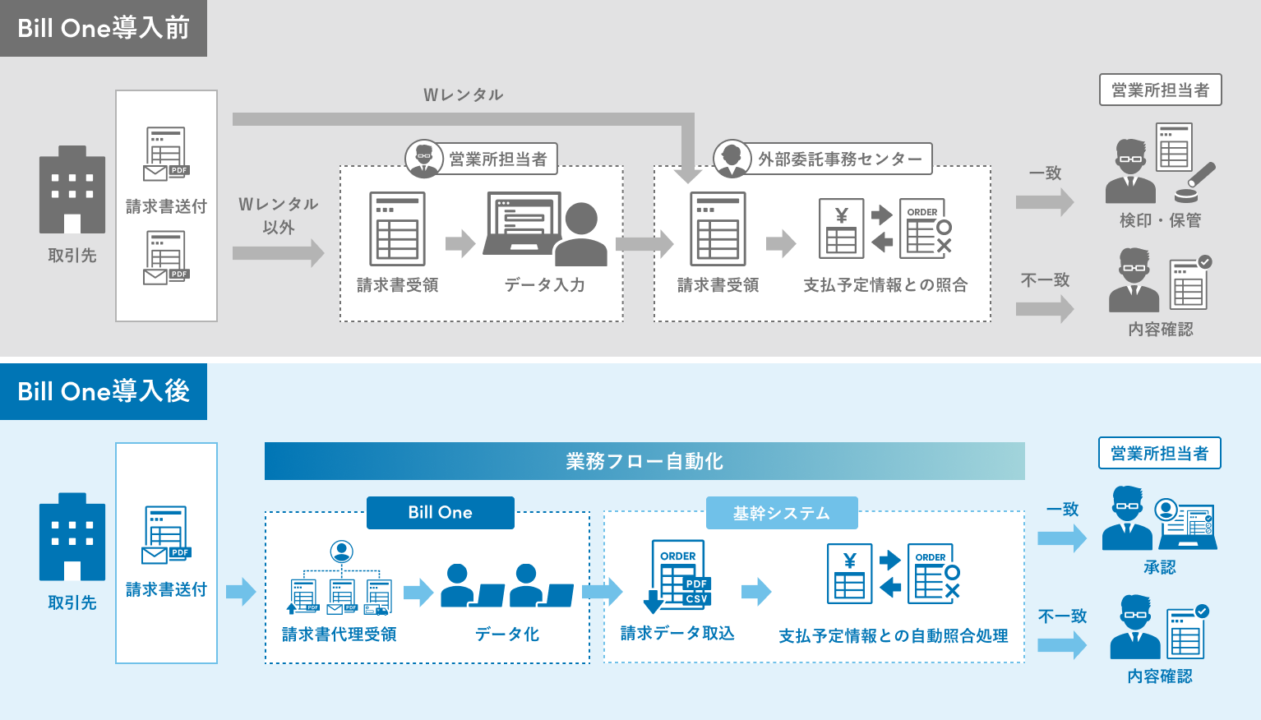 Bill One導入前後の請求書処理業務フローのイメージ図