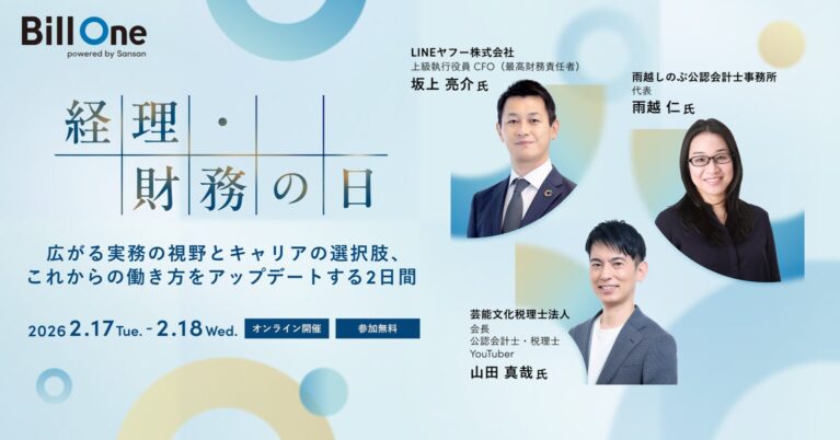 Sansan株式会社が提供する経理AXサービス「Bill One」は、ビジネスイベント「経理・財務の日~広がる実務の視野とキャリアの選択肢、これからの働き方をアップデートする2日間~」を、2026年2月17日(火)・18日(水)の両日13:00よりオンラインにて開催いたします。