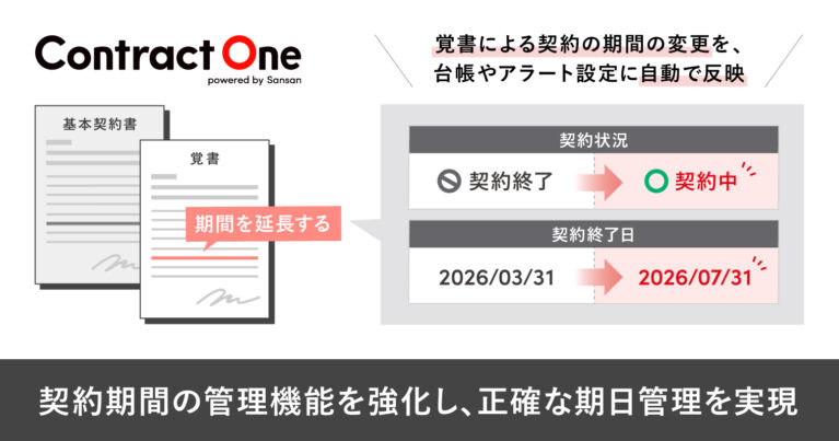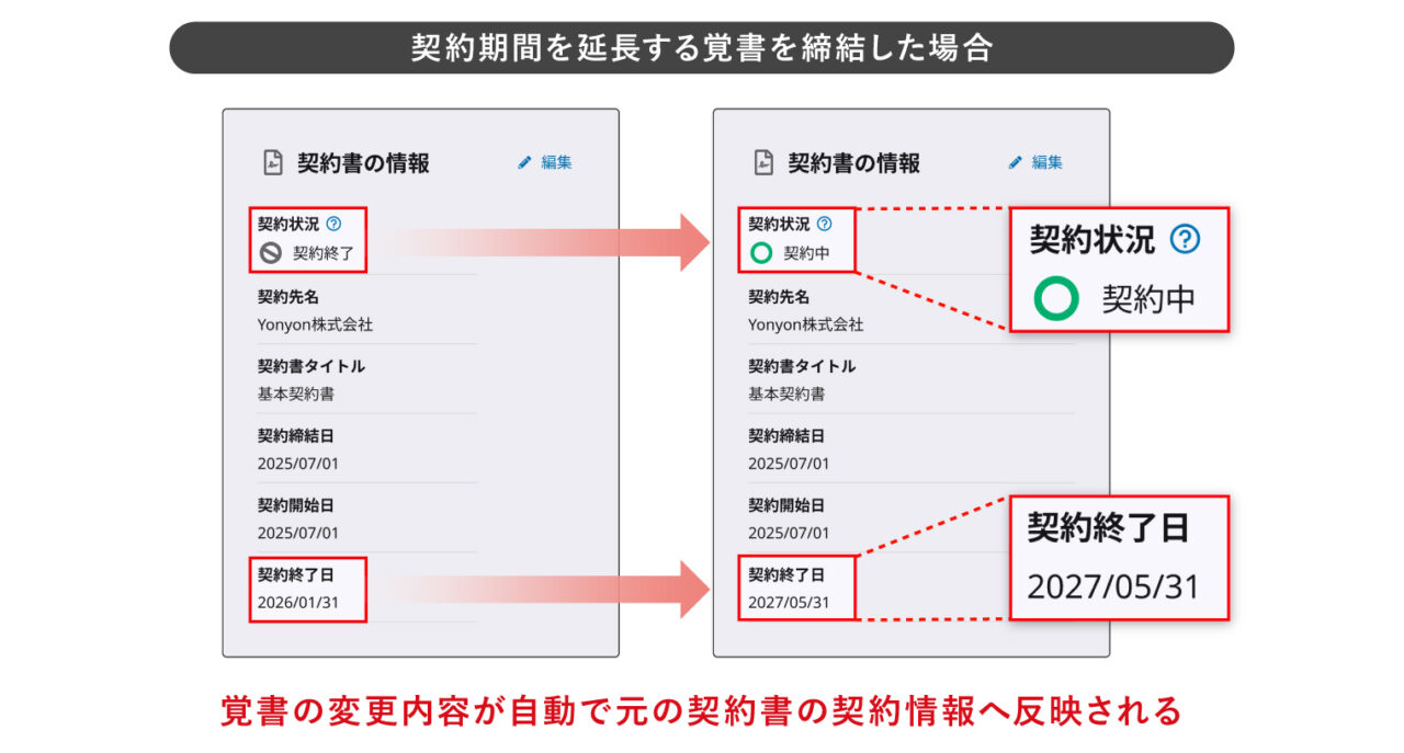 今回のアップデートにより、覚書などの追加契約書によって契約期間を変更したり、解約をしたりした場合に、元の契約書の契約情報にも自動で最新の期間や契約状況が反映されるようになります。これによって、契約終了日を知らせるアラートメールの配信日も自動で更新され、ユーザーは手間なく常に正確な契約期間に基づいた契約管理が可能になります。